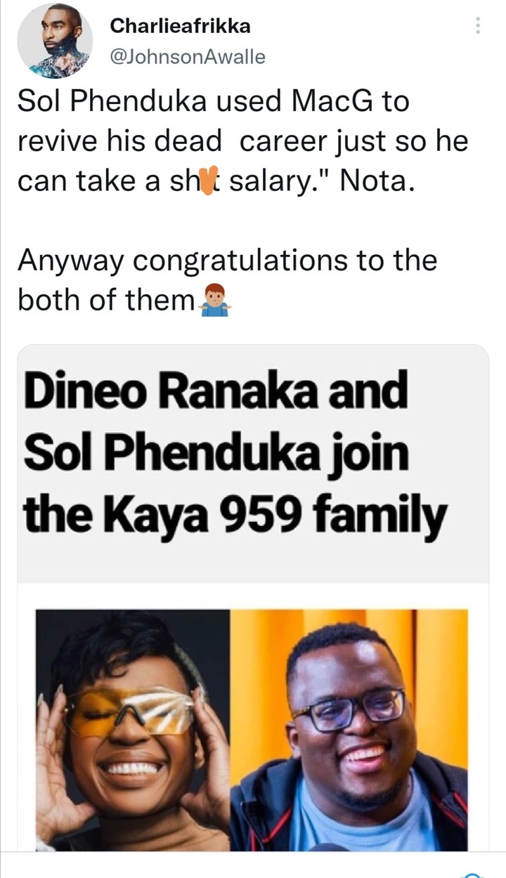 15.06.2022 · sol phenduka instagram dj and and music composer solomzi thandubuntu, better known as sol pheduka, will be joining media personality dineo ranaka at kaya fm when the station's new breakfast show. Vor 1 tag · kaya fm listeners are in for a treat as the talented dineo ranaka and sol phenduka are set to join the station. Nota baloyi is fuming after sol phenduka accepted the kaya fm gig. 11.06.2022 · sol phenduka joins kaya fm. Watch lloyiso covers kanye west's "all mine" 15 june 2022. Nota is not happy that sol took to the gig because he's part of the podcast and chill with macg. This is coming after dineo announced her exit from metro fm after four years of being active on air. Focalistic was invited to the recording academy, grammys. In an earlier statement, dineo said after. Vor 1 tag · sol phenduka, from podcast and chill has bagged himself a new radio gig with kaya fm.